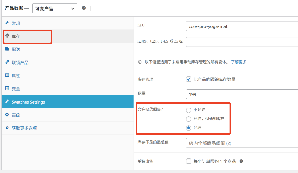 编辑可变产品 —— 库存Stock —— 允许缺货超售 Allow Backorders —— 设为允许 Allow